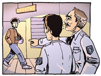 Javier entra en los almacenes. Pero cuando se dirige al departamento de papelería, de repente ve que hay dos guardias de seguridad que se le acercan. El mayor, un hombre gordo y fuerte, dice:
