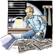 Va a la cocina y bebe rápido un vaso de agua. Después vuelve a su habitación. Se sienta encima de la cama y empieza a leer los periódicos otra vez.