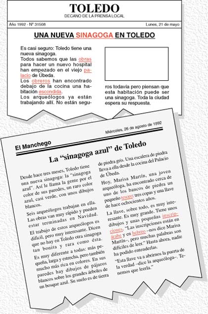 ...en el viejo palacio de Úbeda... los obreros han encontrado... una sinagoga... no hay otra en Toledo tan bonita y rara como ésta... Marisa Martín, una joven arqueóloga, ha encontrado... un pequeño tesoro: tres copas y una llave... La llave... tiene unos dibujos y unas inscripciones... en árabe y hebreo... nadie ha podido entenderlas...