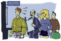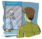 «Buenos días» o «buenas tardes» —piensa Frank—. Los españoles dicen «buenas tardes» sólo después de comer. Y comen casi a las tres. Tengo que decir «buenos días» porque no sé si el señor de la ventanilla ha comido ya. También voy a decir «por favor». Y después, «quiero», «es necesario», «me gusta»... ; esto es más difícil. ¿Por qué en español hay muchos verbos diferentes para decir la misma cosa? Luego, «un billete», «una entrada», «un papel»... Bueno, puedo decir «tique». Eso dicen los españoles en lugar de «ticket». Pero, ¡qué mal hablan inglés los españoles! Ahora viene algo todavía peor: las preposiciones. ¡Hay más de diez preposiciones en español! ¿«A», «por», «en», «para», «hacia», «desde» o «hasta» París? ¿Cuándo usar unas u otras? Esto está en el libro, pero lo tengo en la maleta. Y ahora no puedo abrirla porque después no puedo cerrarla... Solución: escuchar a este señor que está delante de mí y decir las mismas palabras que él.