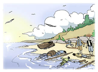 Colón se acercó enseguida. Entre unas grandes piedras había un marinero mayor, vestido con un largo abrigo azul, con los ojos medio abiertos y la cara rota por el dolor. Cuando Cristóbal le dio la mano, él se la cogió fuertemente, intentando decirle algo.