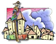 En el centro de la plaza plantan un gran palo untadode grasa. En lo alto del palo hay un jamón. Los jóvenes intentan una y otra vez, escalar el palo para llevarse el jamón, pero