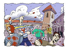 Pronto el suelo está lleno de tomates y entonces empieza la verdadera batalla campal. Todo el mundo se pelea por cogerlos y lanzarlos con todas sus fuerzas a los demás. Los tomates son blandos, pero si los lanzas con fuerza hacen daño. Explotan y se machacan contra la gente, contra el suelo, contra las paredes de las casas, contra las ventanas. Una lluvia de tomates te cae encima y no puedes hacer nada para evitarlo. Por el suelo pasa un río de tomate triturado. La plaza se tiñe de rojo, las calles se cubren de salsa de tomate, suficiente como para cubrir al menos un millón de pizzas.