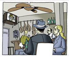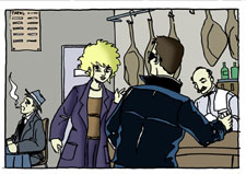 En un rincón, al fondo, hay una mujer rubísima con el pelo muy corto y rizado que saluda al joven. Susi y Pepe se sientan en una mesa cerca, pero no pueden oír lo que dicen. Pepe se toma el cóctel del día. Está nervioso y necesita algo fuerte. Sabe que está cerca del final del caso. Una media hora después el joven se va.