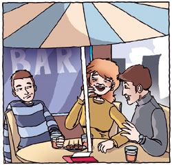 Inmediatamente le presenté a Marisa y nos sentamos a tomar una caña en la terraza de una cafetería. Él, mucho más listo que yo, enseguida se dio cuenta de que dejar escapar a esa chica era de idiotas, así que empezó a comportarse como él sabía hacerlo en circunstancias especiales. Fue todavía más brillante, más simpático, más mundano. Su risa dejaba al descubierto su dentadura blanca, su voz viril se mezclaba con el ruido de los coches, y Marisa, poco a poco, empezó discretamente a darme la espalda y a girar la cabeza en dirección a mi amigo.