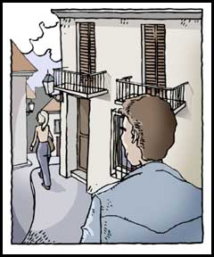 Por pequeñas calles blancas y llenas de jardines llegan hasta la Iglesia de San Nicolás. No hay mucha gente en la calle a esta hora y Pepe tiene que seguirla de lejos para no ser descubierto. A veces tiene miedo de perderla. Sería una pena porque le parece que la cosa se está poniendo interesante.