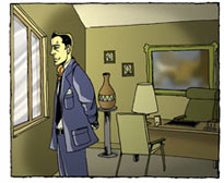 Cuando acaban las noticias se levanta y se dirige a la cocina. Abre el frigorífico y saca una lata de cerveza. La pone en una bandeja. Corta unos trozos de queso, los coloca en un platito, lo pone también en la bandeja y se lo lleva todo a su despacho. Tiene que planear su próximo trabajo. Y siempre piensa mejor mientras come y bebe algo.